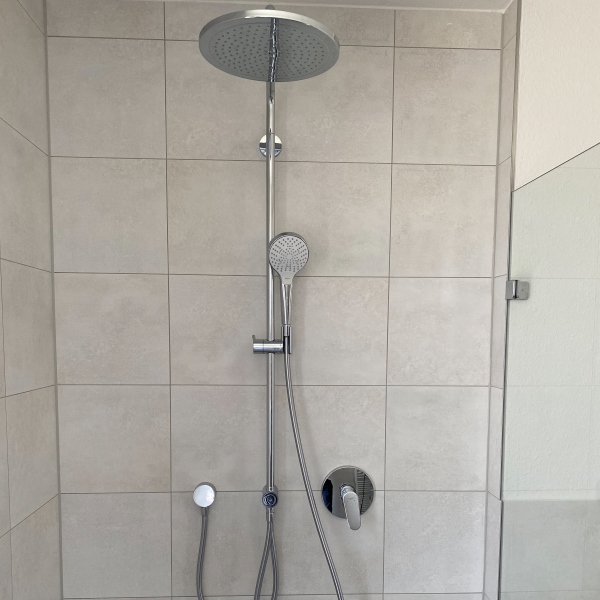 Die bodengleich gefliesten Duschböden mit punktuellem Bodenablauf und einem entsprechenden Fliesengefälle zieren (in diesem Beispiel der Musterwohnung) Mittelmosaikfliesen.