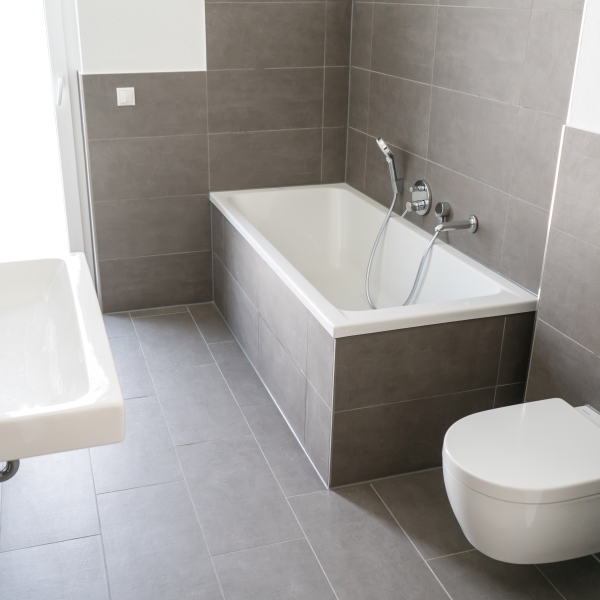 Die Auswahl bei den Bodenfliesen in Bädern, Dusch-WCs und WCs trifft der Käufer in Absprache mit dem Handwerker. Die Größe der Fliesen ist im Standard bis maximal 30 x 60 cm möglich. Die Farbauswahl erfolgt durch den Käufer zusammen mit dem Handwerker.
